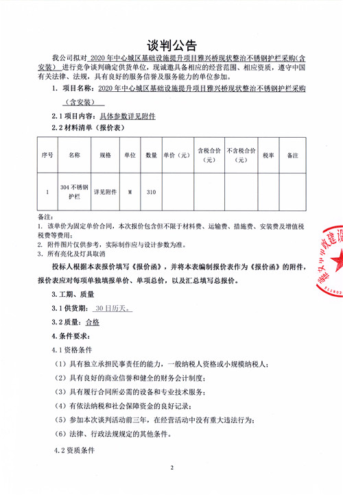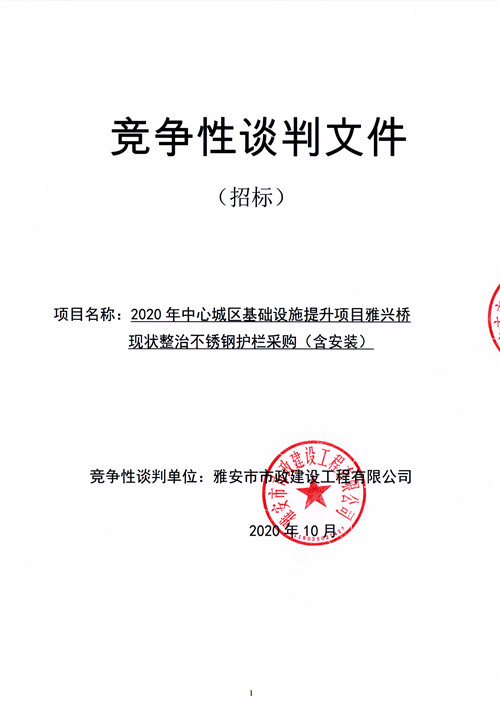 市政公司2020年中心城區(qū)基礎設施提升項目雅興橋現(xiàn)狀整治不銹鋼護欄采購(含安裝)競爭性談判公告