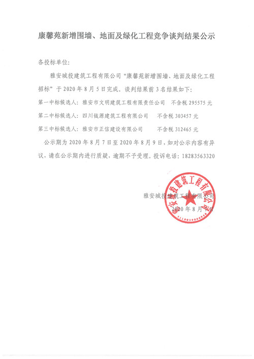 城投建工公司康馨苑新增圍墻、地面及綠化工程競(jìng)爭性談判結(jié)果公示