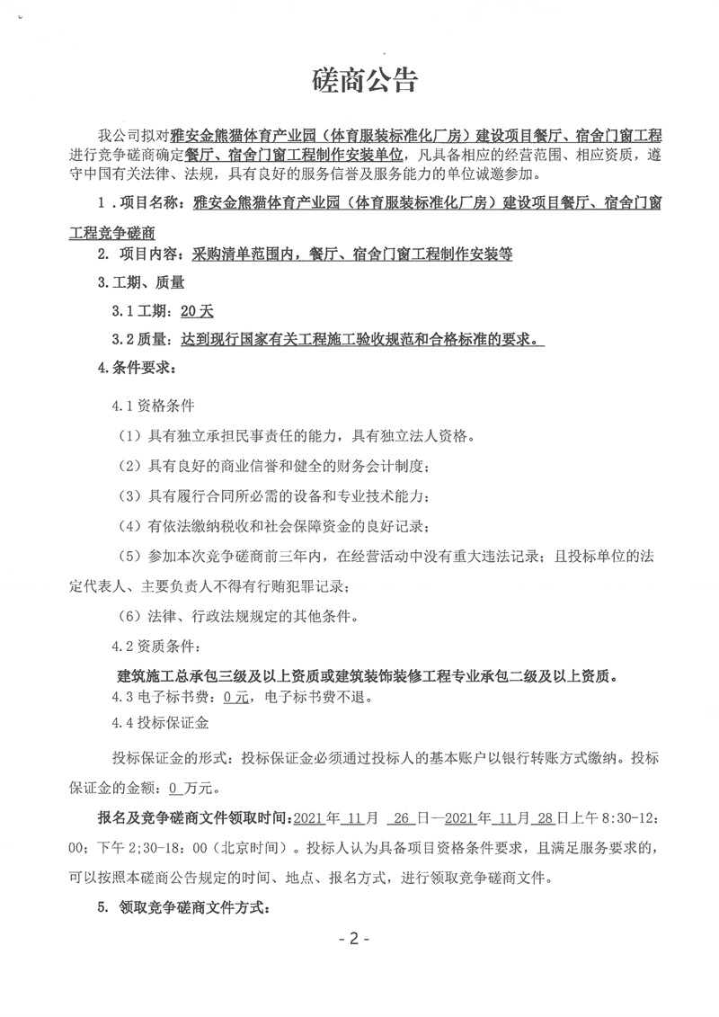 雅安金熊貓?bào)w育產(chǎn)業(yè)園(體育服裝標(biāo)準(zhǔn)化廠房)建設(shè)項(xiàng)目餐廳、宿舍門窗工程競爭磋商公告