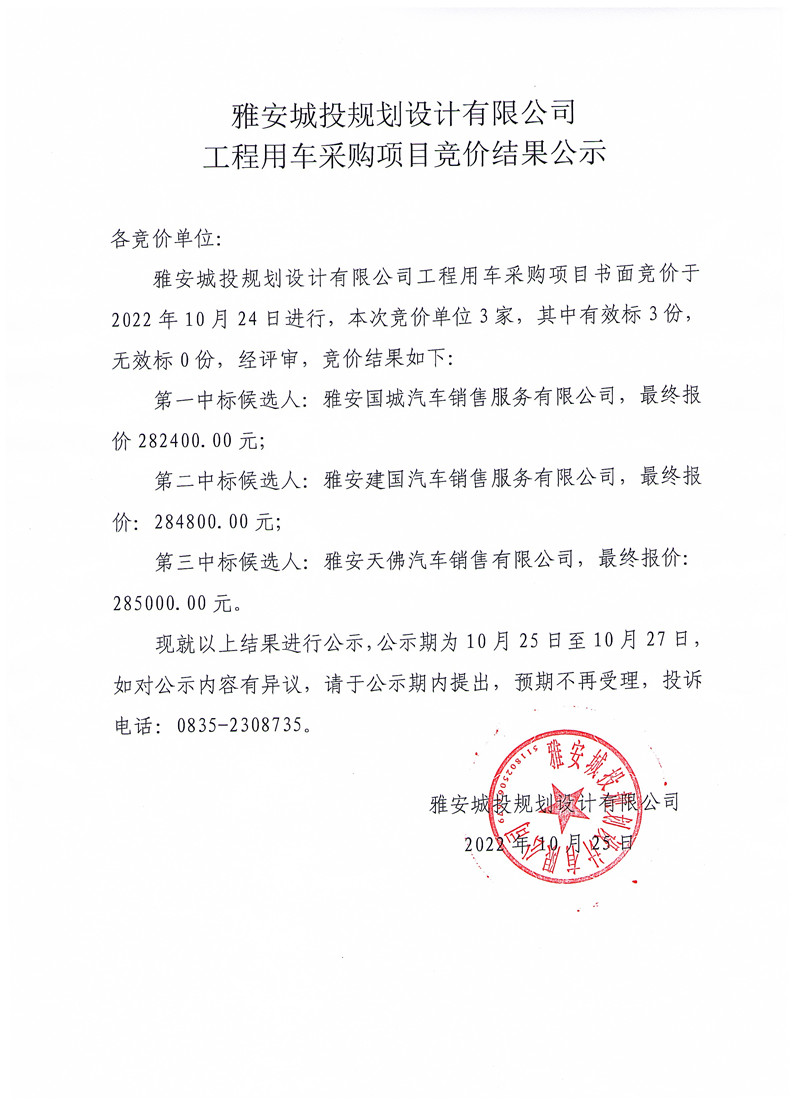 雅安城投規(guī)劃設(shè)計(jì)有限公司工程用車(chē)采購(gòu)項(xiàng)目競(jìng)價(jià)結(jié)果公示