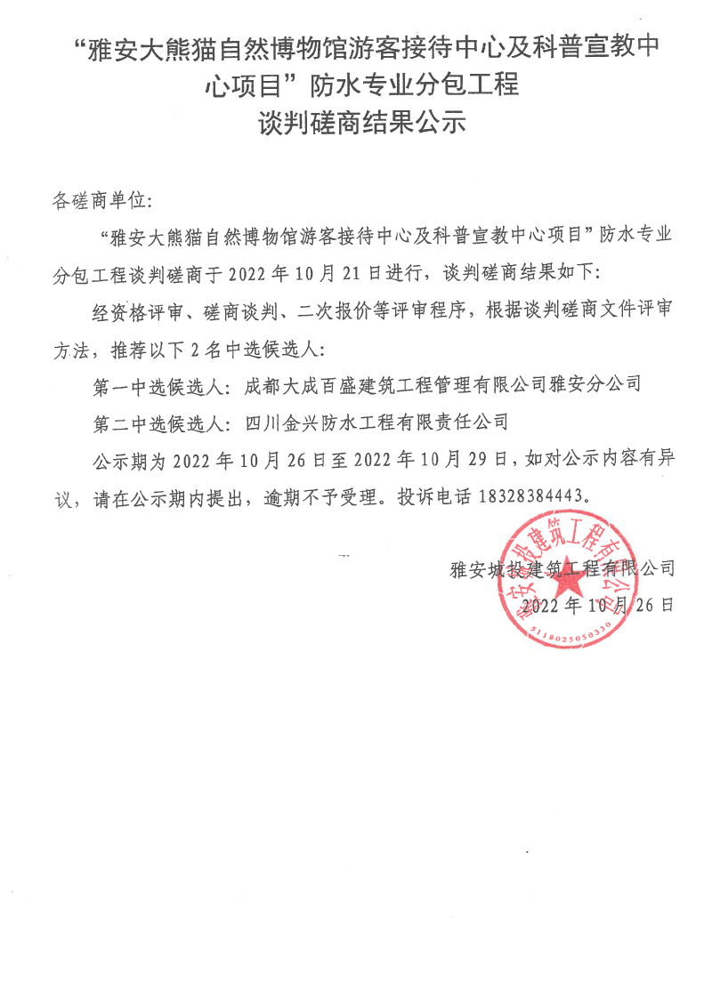 雅安大熊貓自然博物館游客接待中心及科普宣教中心項目防水專業(yè)分包工程談判磋商結(jié)果公示
