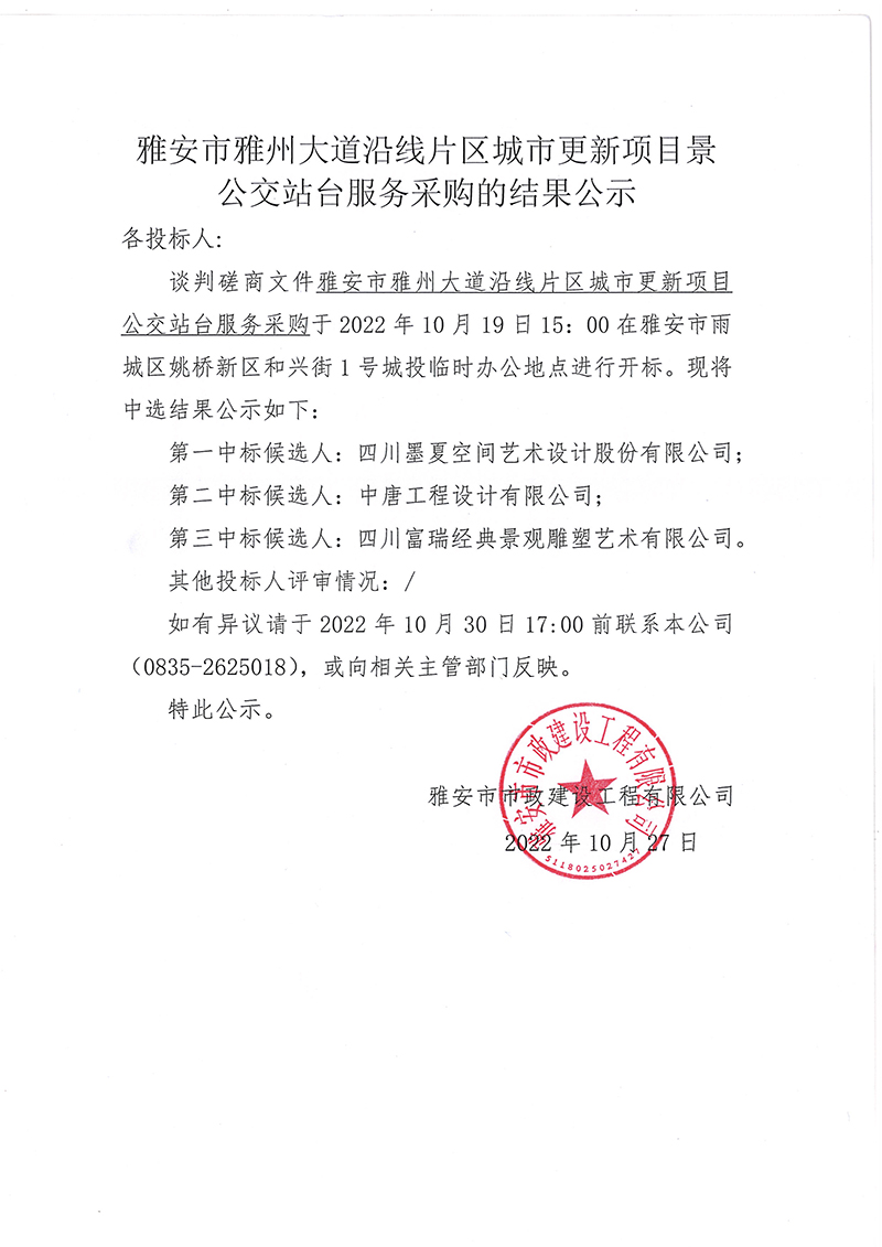 雅安市雅州大道沿線片區(qū)城市更新項目景觀公交站臺服務采購的結果公示