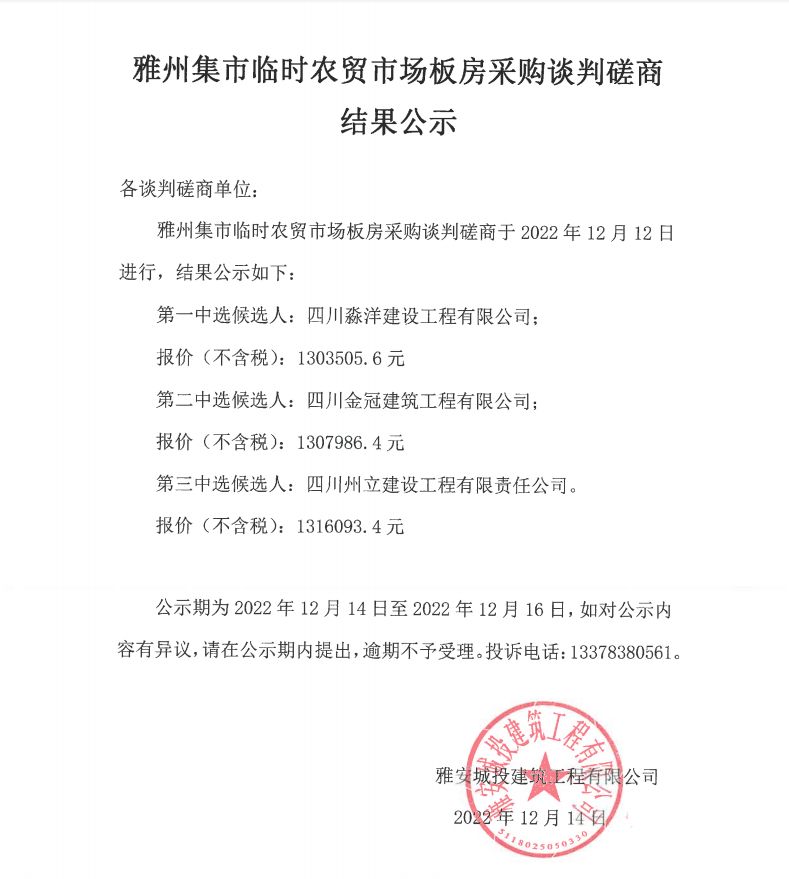 雅州集市臨時農(nóng)貿(mào)市場板房采購談判磋商結(jié)果公示
