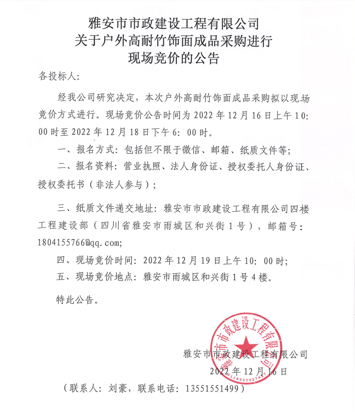 雅安市市政建設(shè)工程有限公司關(guān)于戶外高耐竹飾面成品采購進行現(xiàn)場競價公告