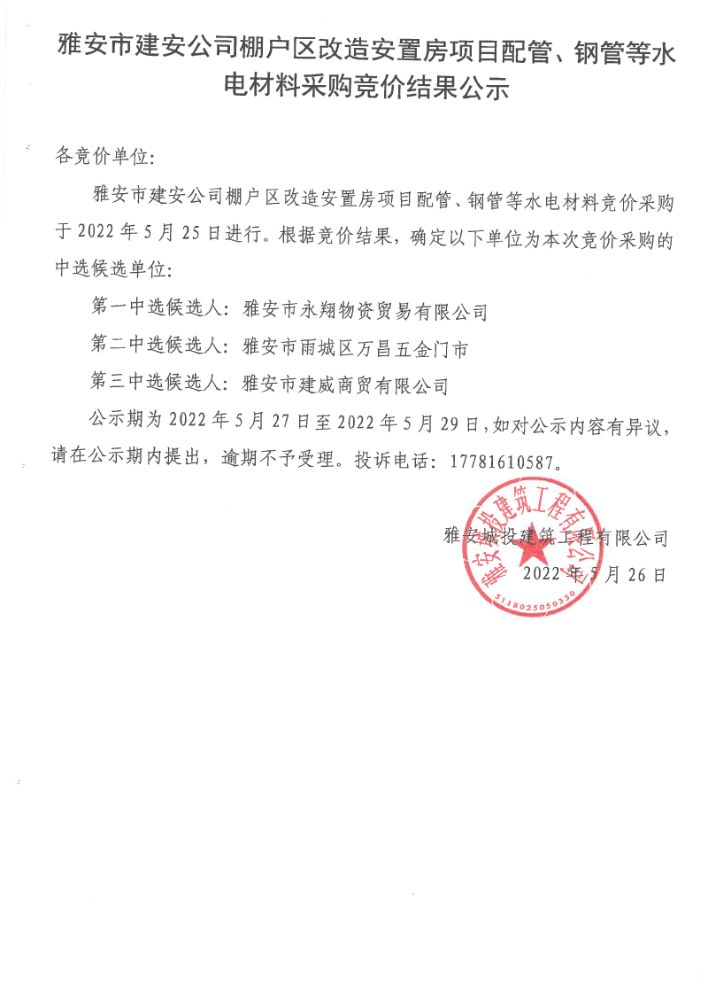 雅安市建安公司棚戶區(qū)改造安置房項目配管、鋼管等水電材料采購競價結果公示