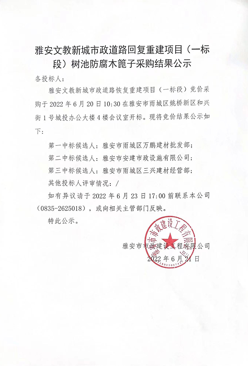 雅安市文教新城市政道路恢復 重建項目工程(一標段)樹池防腐木篦子采購結果公示