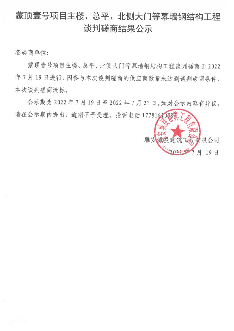 蒙頂壹號(hào)項(xiàng)目主樓、總坪、北側(cè)大門等幕墻鋼結(jié)構(gòu)工程談判磋商結(jié)果公示
