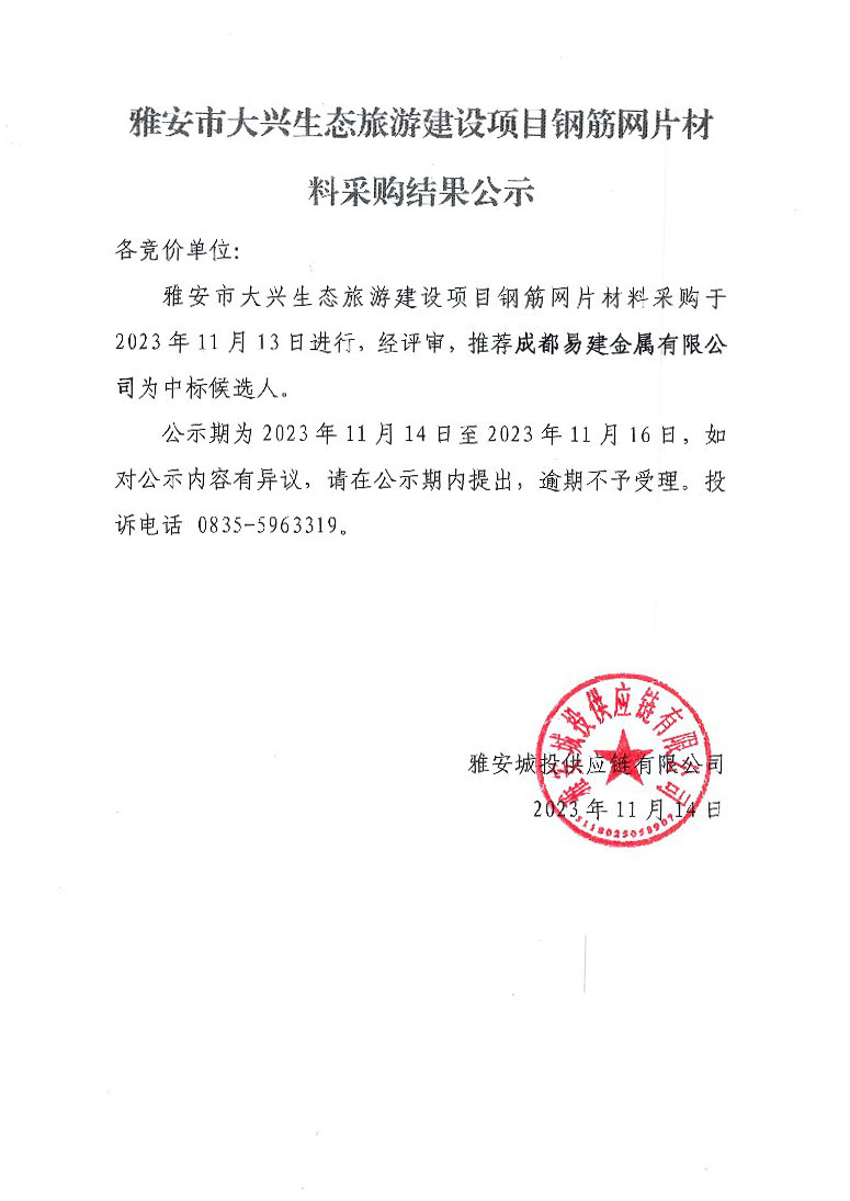雅安市大興生態(tài)旅游建設項目鋼筋網(wǎng)片材料采購結果公示