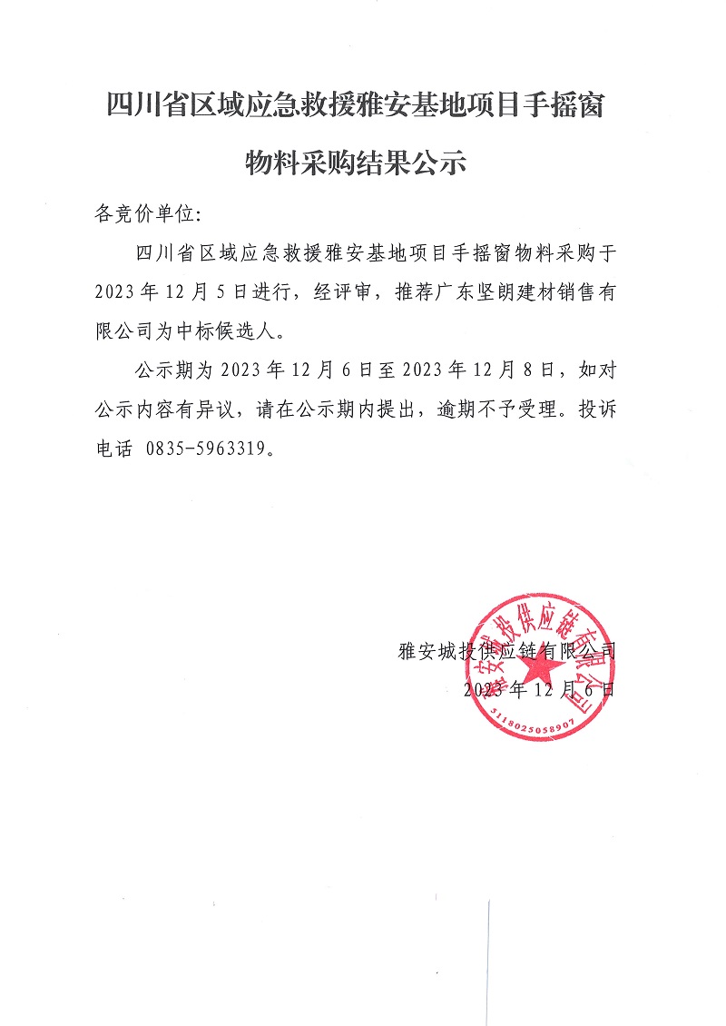 四川省區(qū)域應(yīng)急救援雅安基地項目手搖窗物料采購結(jié)果公示