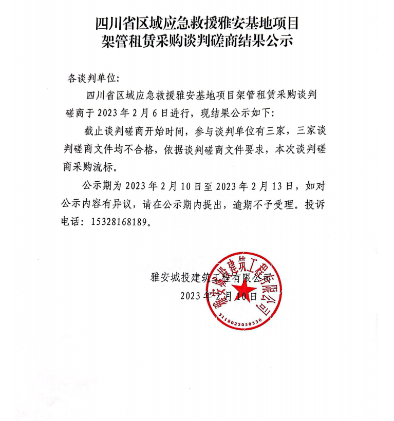 四川省區(qū)域應(yīng)急救援雅安基地項目架管租賃采購談判磋商結(jié)果公示