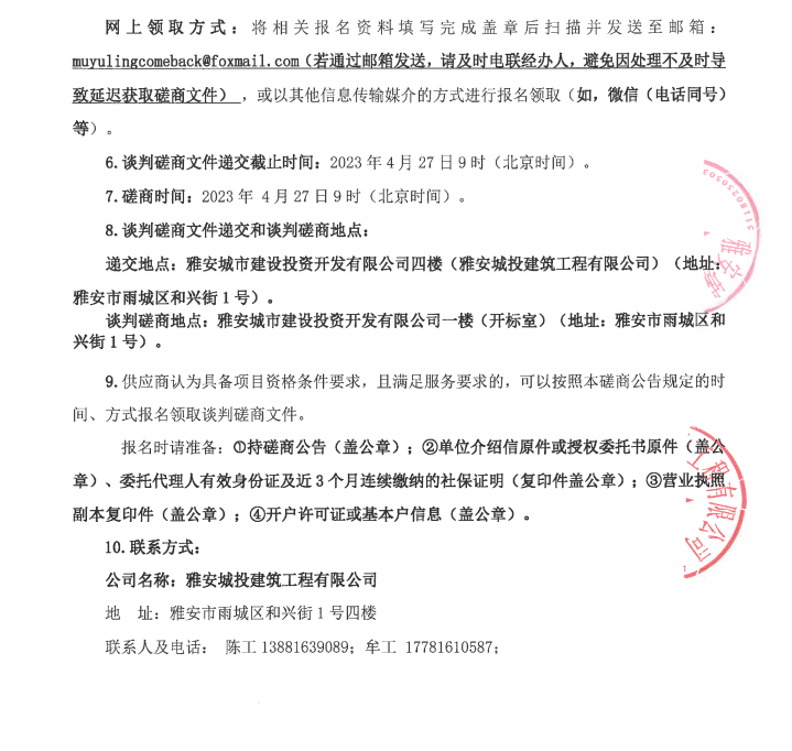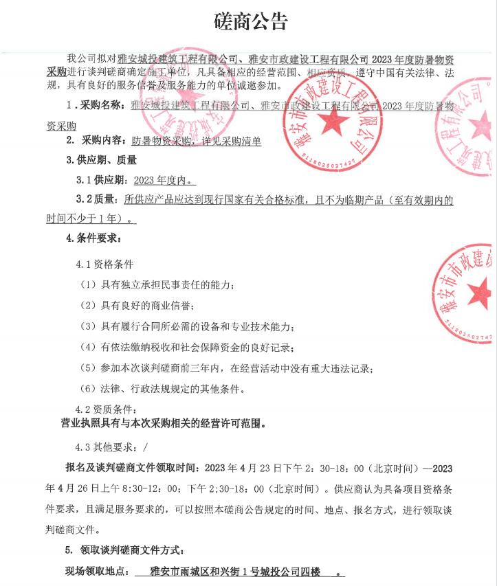雅安城投建筑工程有限公司、雅安市政建設(shè)工程有限公司2023年度防暑物資采購談判磋商公告