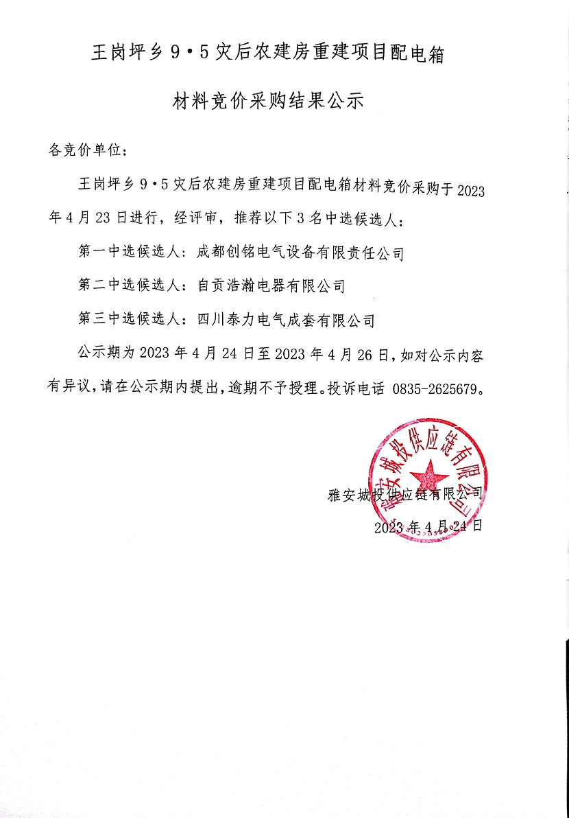 王崗坪鄉(xiāng)9·5災后農(nóng)建房重建項目配電箱材料競價采購結(jié)果公示
