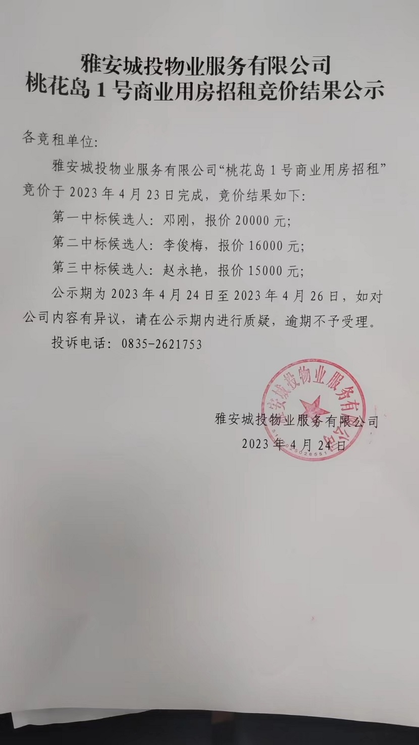 雅安城投物業(yè)服務(wù)有限公司桃花島1號(hào)商業(yè)用房招租競(jìng)價(jià)結(jié)果公示