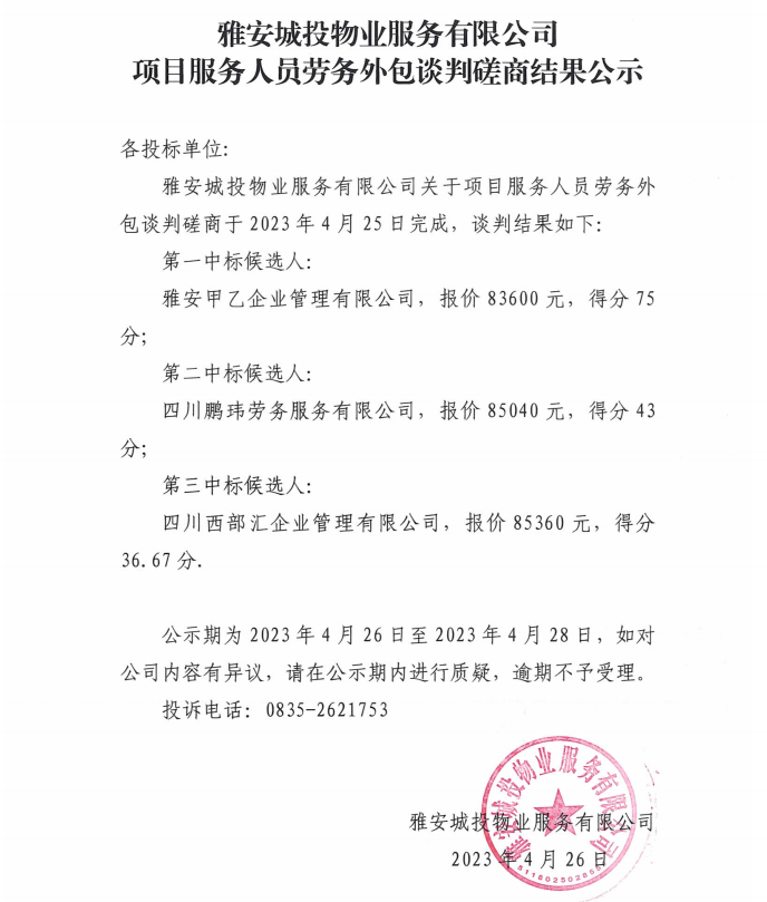 雅安城投物業(yè)服務(wù)有限公司項(xiàng)目服務(wù)人員勞務(wù)外包談判磋商結(jié)果公示