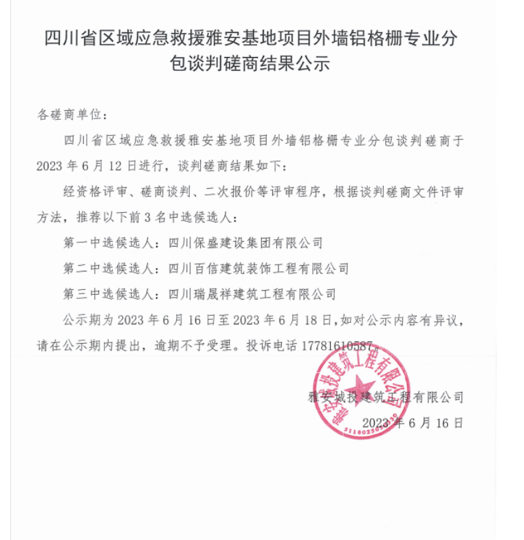 四川省區(qū)域應(yīng)急救援雅安基地項(xiàng)目外墻鋁格柵專(zhuān)業(yè)分包談判磋商結(jié)果公示