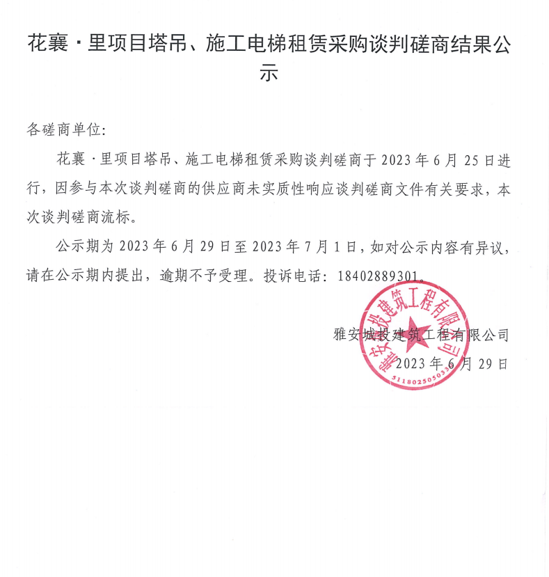 花襄·里項目塔吊、施工電梯租賃采購談判磋商結果公示