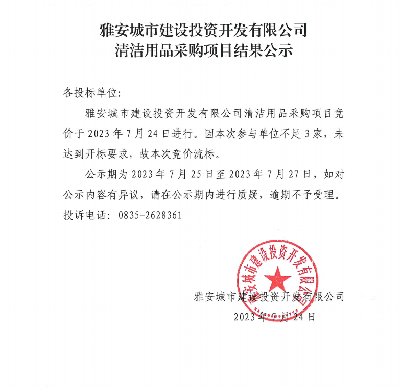 雅安城市建設(shè)投資開發(fā)有限公司清潔用品采購項(xiàng)目結(jié)果公示
