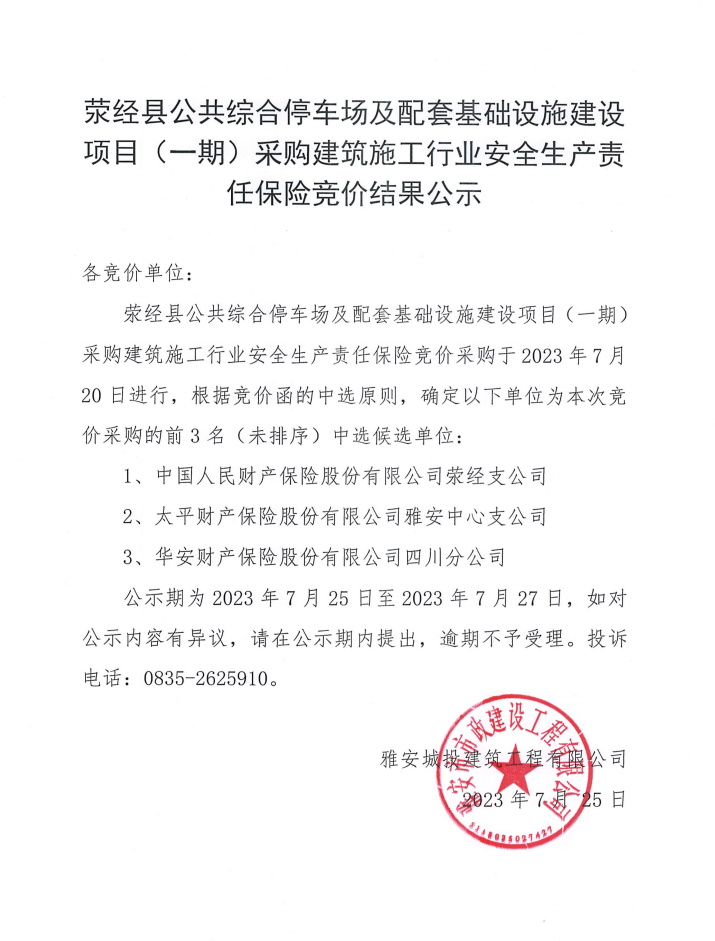 滎經(jīng)縣公共綜合停車場(chǎng)及配套基礎(chǔ)設(shè)施建設(shè)項(xiàng)目(一期)采購建筑施工行業(yè)安全生產(chǎn)責(zé)任保險(xiǎn)競(jìng)價(jià)結(jié)果公示