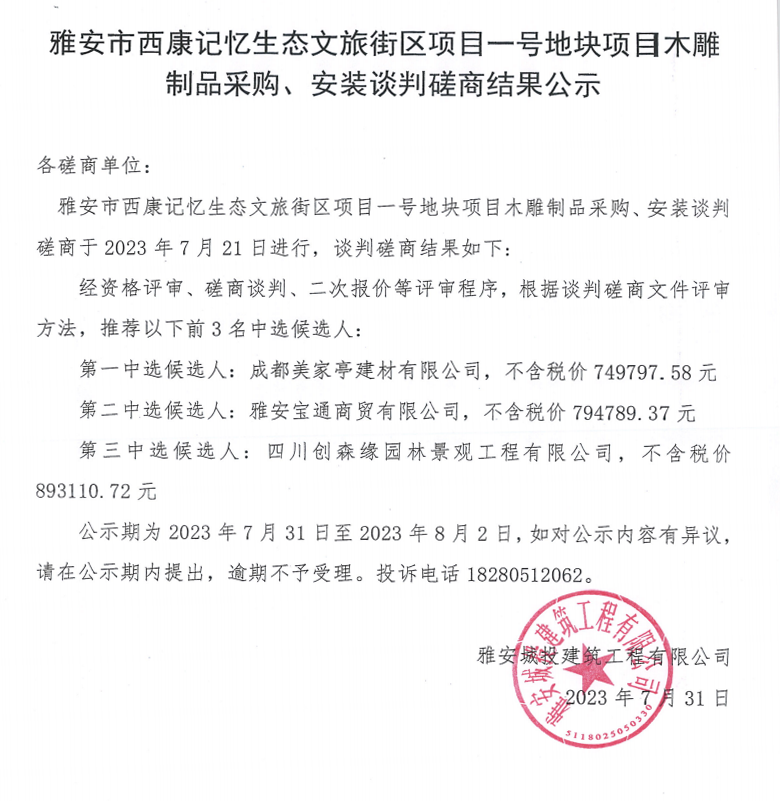 雅安市西康記憶生態(tài)文旅街區(qū)項(xiàng)目一號(hào)地塊項(xiàng)目木雕制品采購(gòu)、安裝談判磋商結(jié)果公示