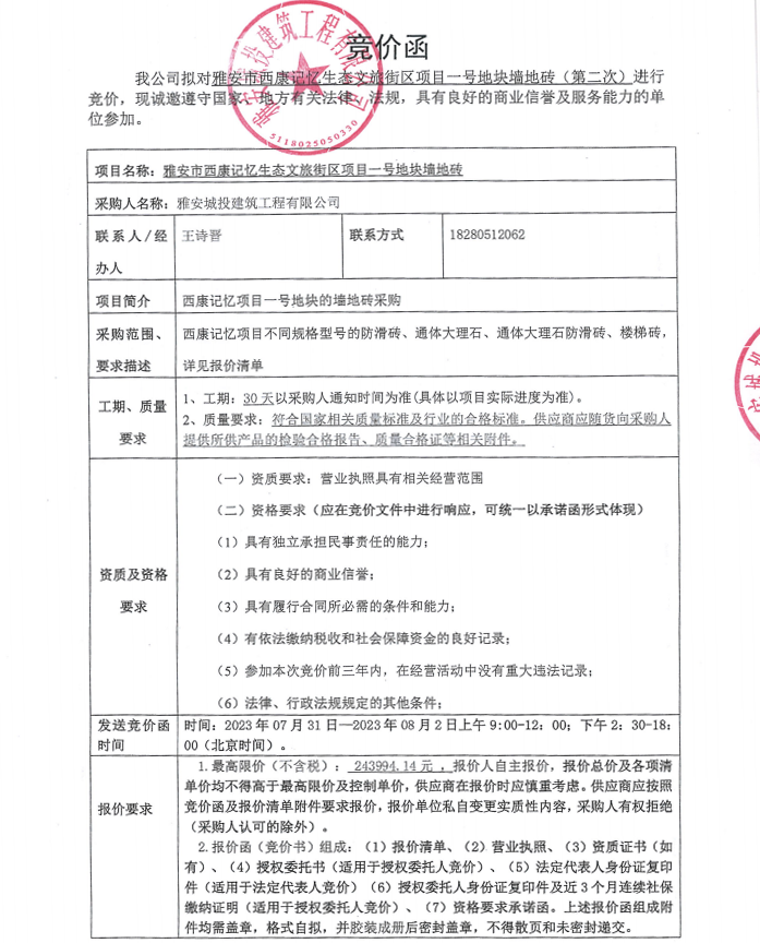 雅安市西康記憶生態(tài)文旅街區(qū)項(xiàng)目一號(hào)地塊墻地磚(第二次)競(jìng)價(jià)采購(gòu)公告