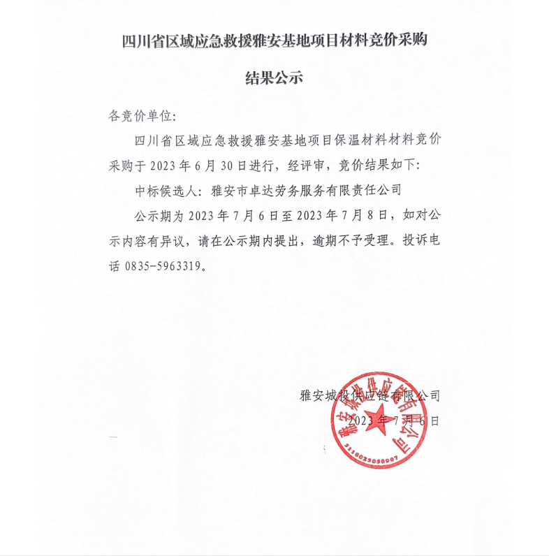四川省區(qū)域應(yīng)急救援雅安基地項目材料競價采購結(jié)果公示
