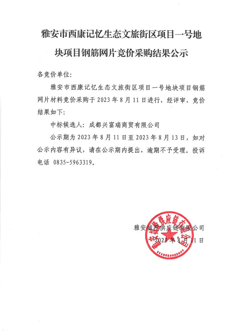 雅安市西康記憶生態(tài)文旅街區(qū)項(xiàng)目一號(hào)地塊項(xiàng)目鋼筋網(wǎng)片競(jìng)價(jià)采購(gòu)結(jié)果公示