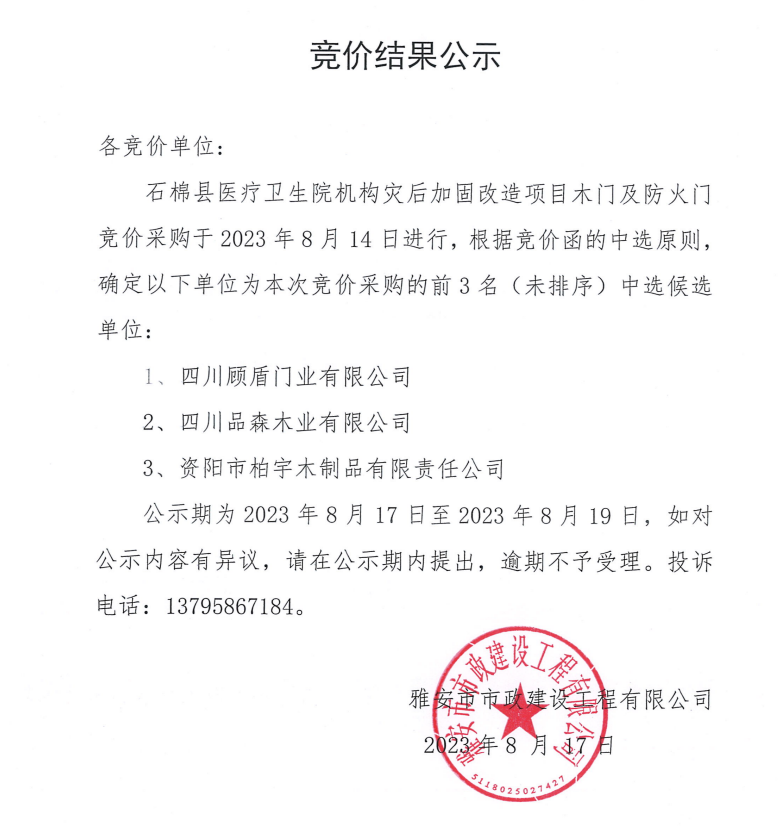石棉縣醫(yī)療衛(wèi)生院機構災后加固改造項目木門及防火門競價采購結果公示