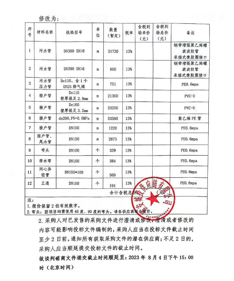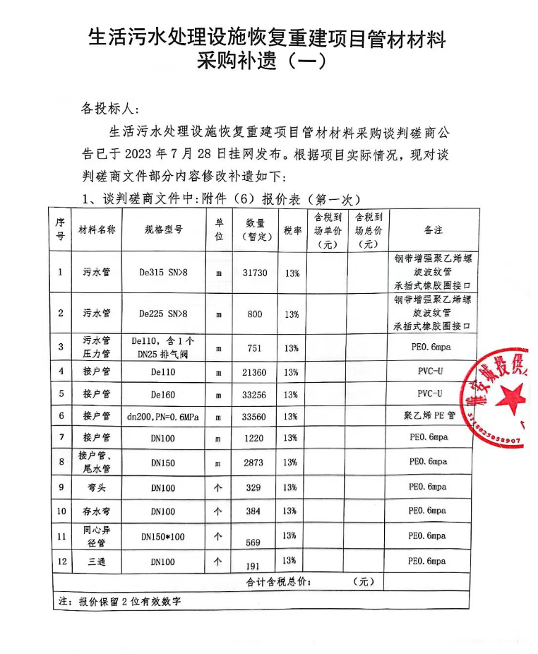 生活污水處理設(shè)施恢復(fù)重建項(xiàng)目管材材料采購(gòu)補(bǔ)遺(一)