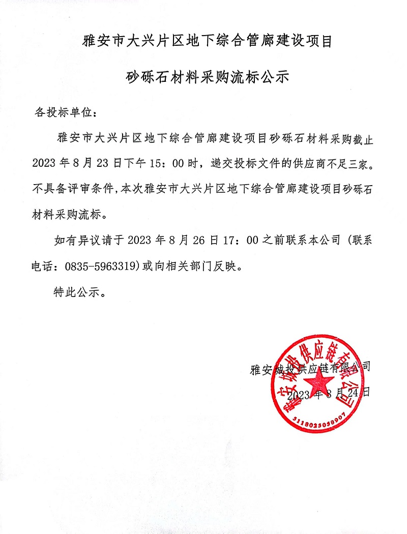 雅安市大興片區(qū)地下綜合管廊建設(shè)項目砂礫材料采購流標(biāo)公示