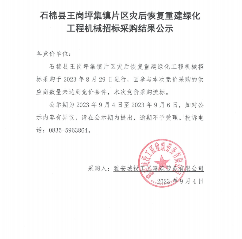 石棉縣王崗坪集鎮(zhèn)片區(qū)災后恢復重建綠化工程機械招標采購結果公示