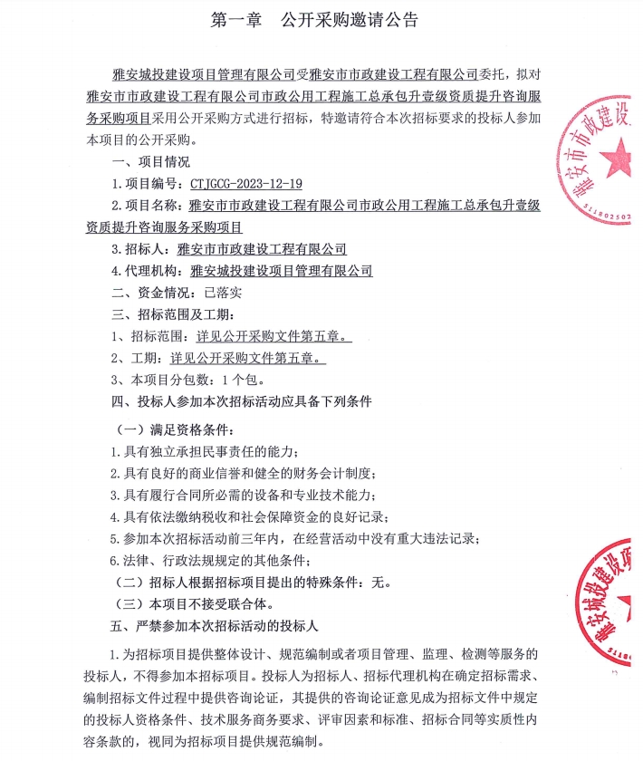 雅安市市政建設(shè)工程有限公司市政公用工程施工總承包升壹級(jí)資質(zhì)提升咨詢服務(wù)采購項(xiàng)目公開采購邀請(qǐng)公告