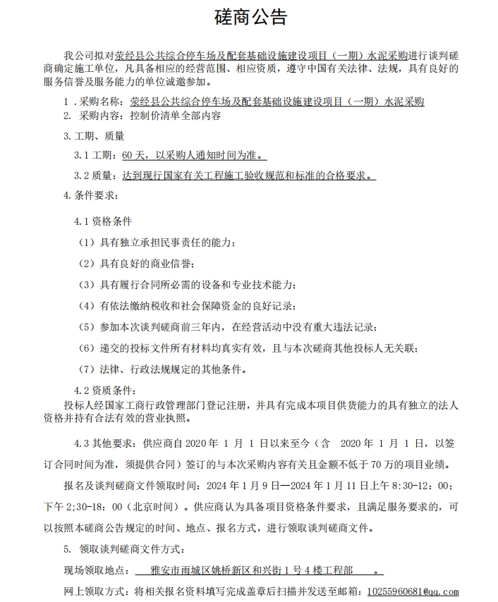 滎經(jīng)縣公共綜合停車(chē)場(chǎng)及配套基礎(chǔ)設(shè)施建設(shè)項(xiàng)目(一期)水泥材料采購(gòu)談判磋商公告