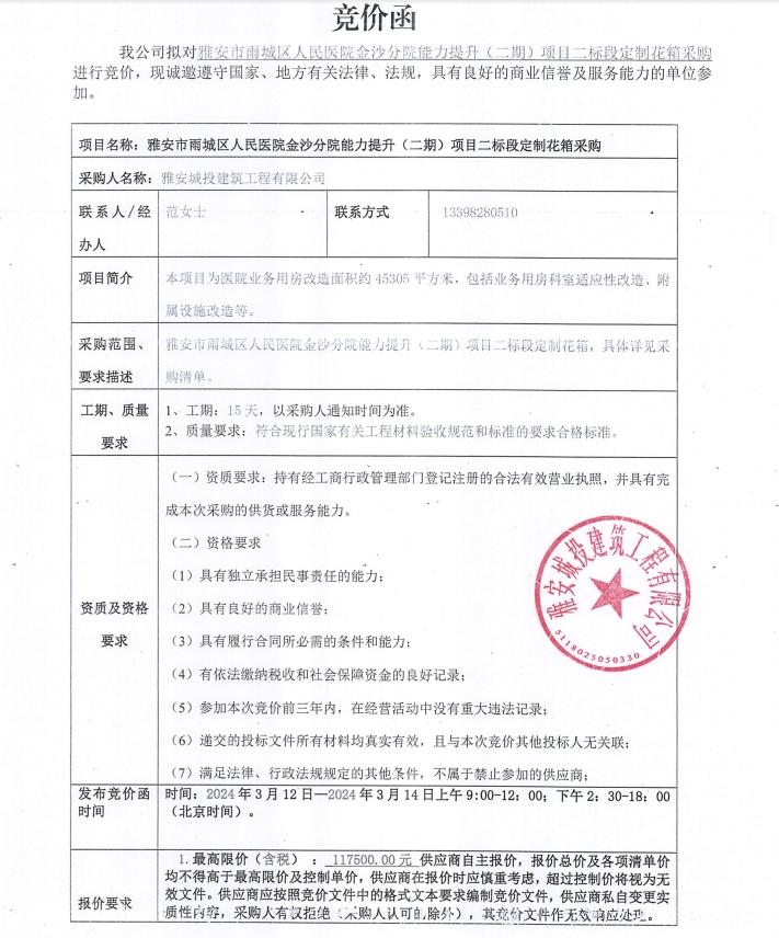 雅安市雨城區(qū)人民醫(yī)院金沙分院能力提升(二期)項(xiàng)目二標(biāo)段定制花箱采購(gòu)競(jìng)價(jià)公告