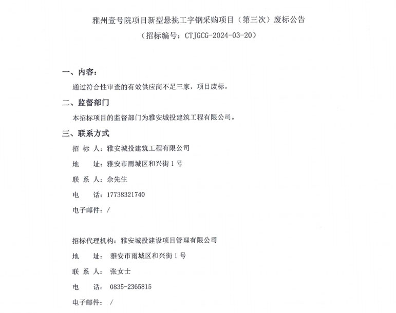 雅州壹號(hào)院項(xiàng)目新型懸挑工字鋼采購項(xiàng)目(第三次)廢標(biāo)公告