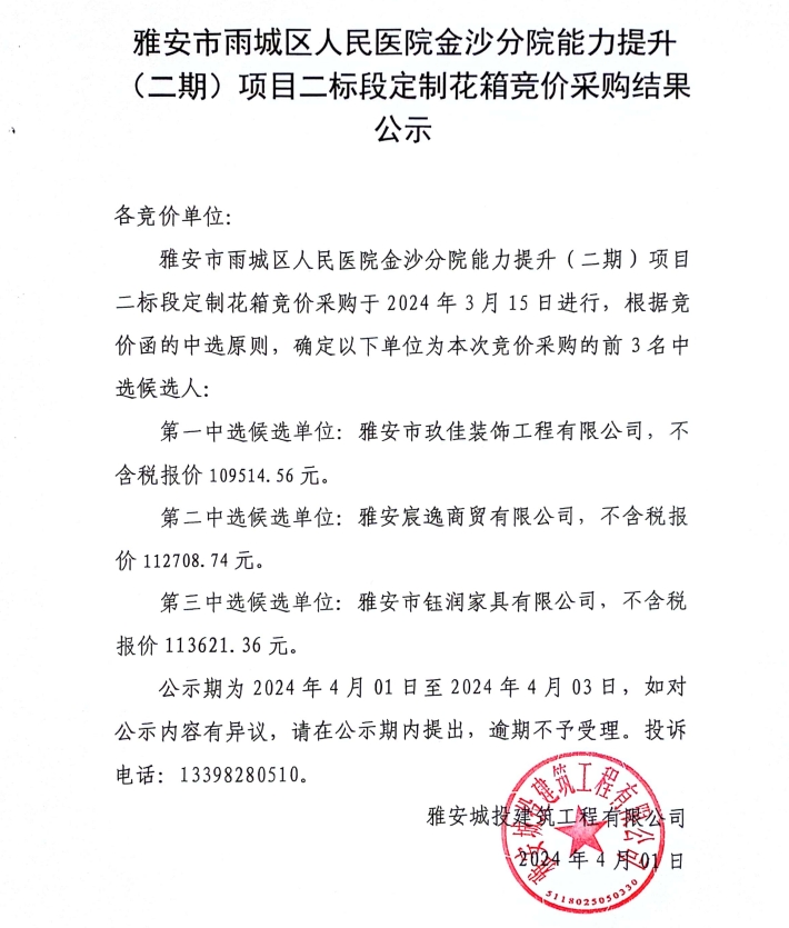 雅安市雨城區(qū)人民醫(yī)院金沙分院能力提升(二期)項目二標段定制花箱競價采購結(jié)果公示
