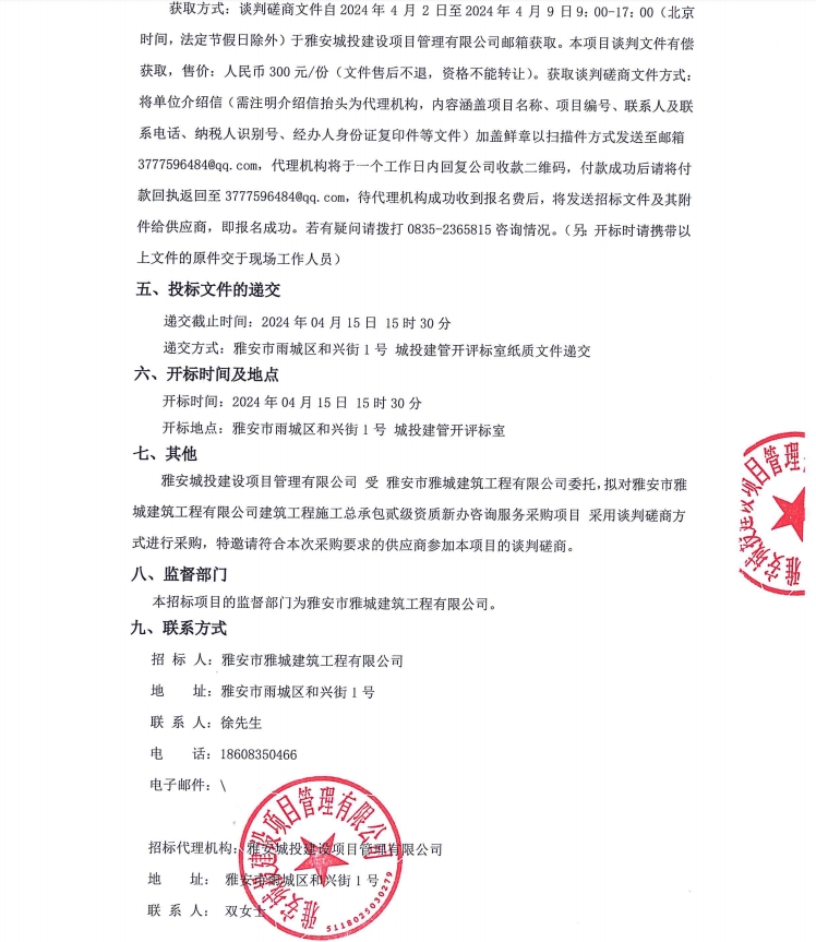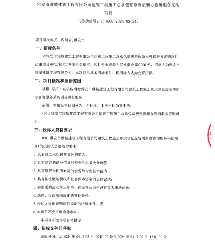 雅安市雅城建筑工程有限公司建筑工程施工總承包貳級(jí)資質(zhì)新辦咨詢服務(wù)采購項(xiàng)目公告