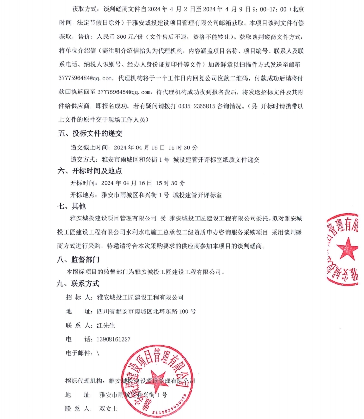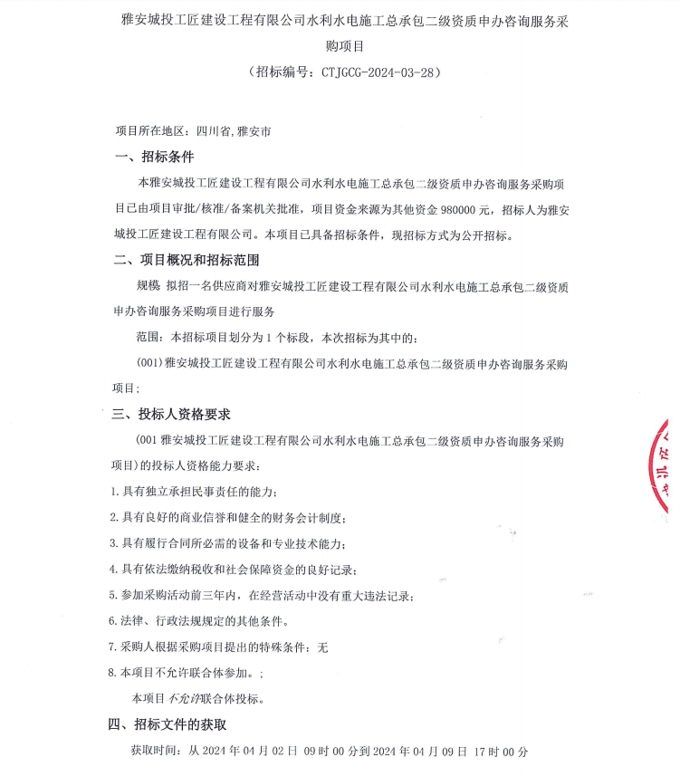 雅安城投工匠建設工程有限公司水利水電施工總承包二級資質(zhì)申辦咨詢服務采購項目公告