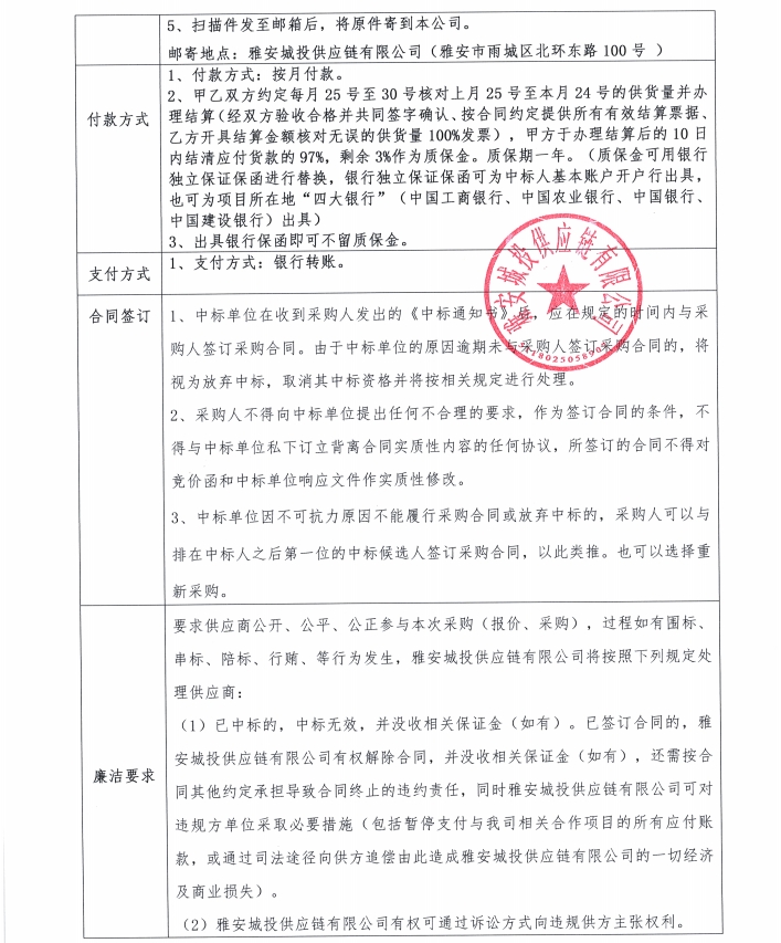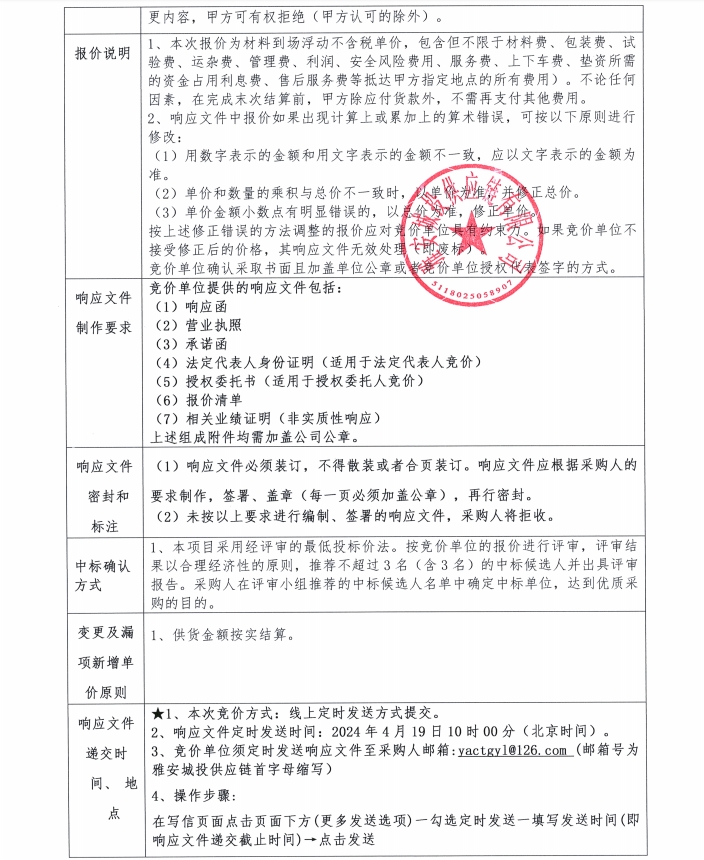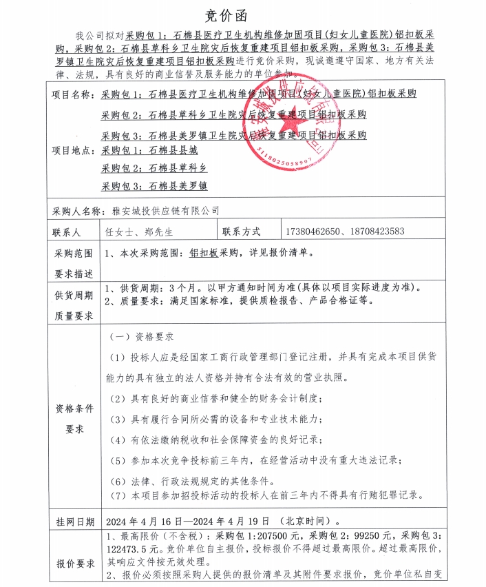 雅安城投供應鏈有限公司鋁扣板采購競價公告