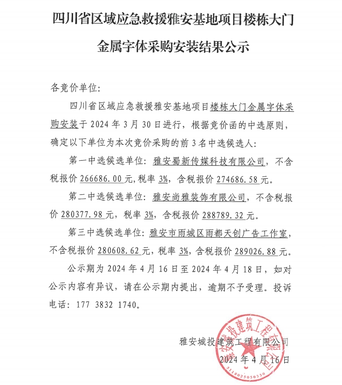 四川省區(qū)域應(yīng)急救援雅安基地項(xiàng)目樓棟大門金屬字體采購安裝結(jié)果公示
