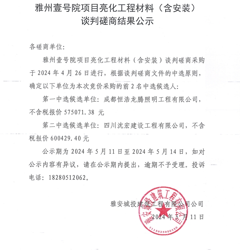 雅州壹號院項目亮化工程材料(含安裝)談判磋商結(jié)果公示