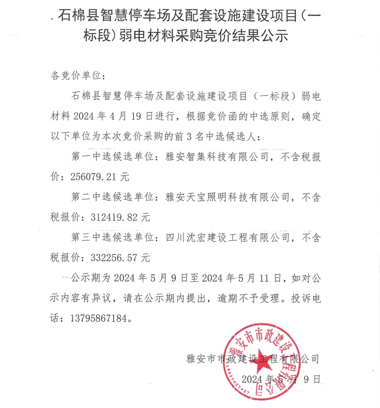 石棉縣智慧停車場及配套設備建設項目(一標段)弱電材料采購競價結(jié)果公示