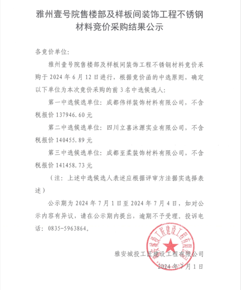 雅州壹號(hào)院售樓部及樣板間裝飾工程不銹鋼材料競價(jià)采購結(jié)果公示