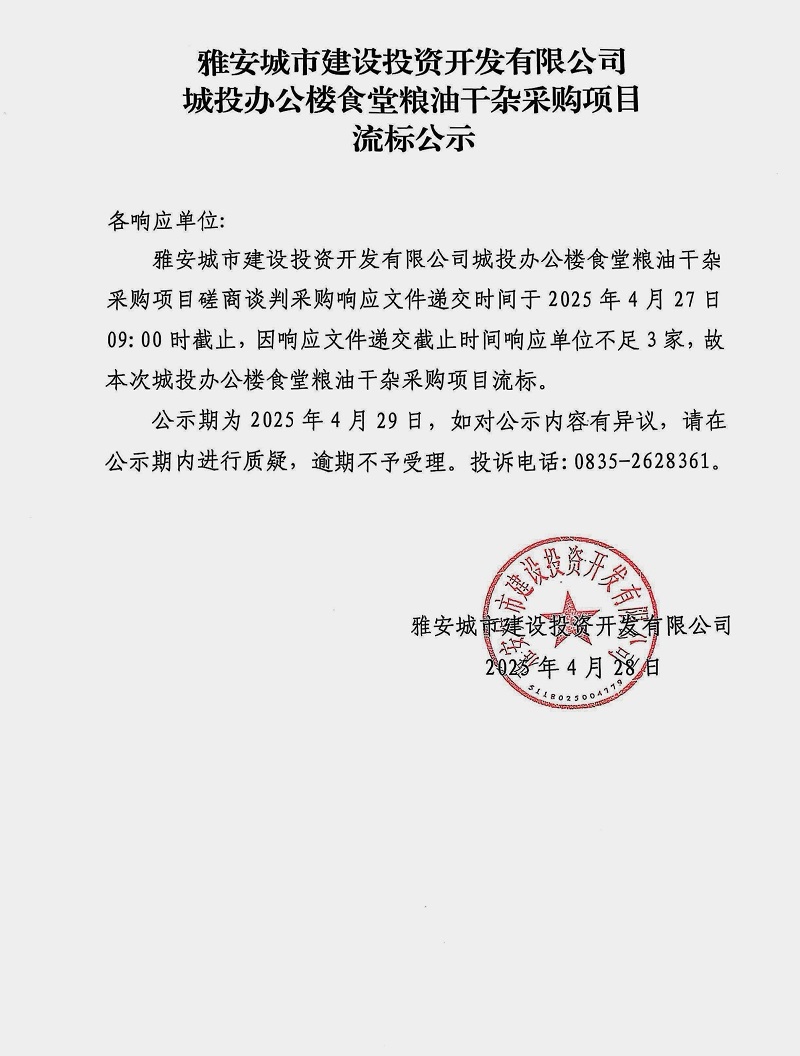 雅安城市建設(shè)投資開(kāi)發(fā)有限公司辦公樓食堂干雜采購(gòu)項(xiàng)目流標(biāo)公示