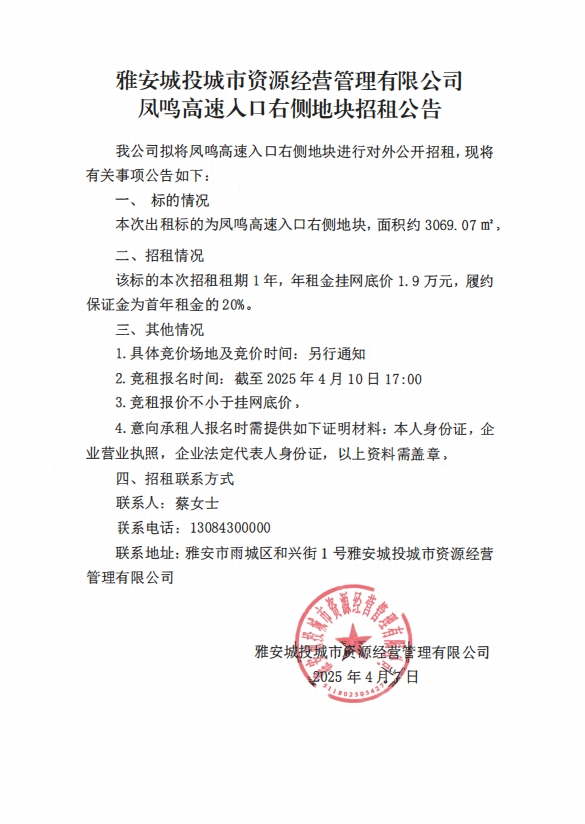 雅安城投城市資源經(jīng)營管理有限公司鳳鳴高速入口右側地塊招租公告