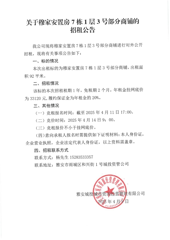 關于穆家安置房7棟1層3號部分商鋪的招租公告