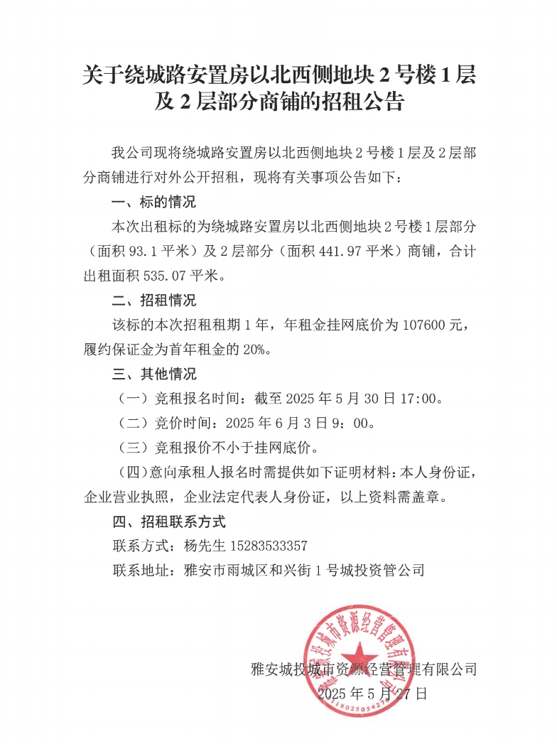 關于繞城路安置房以北西側地塊2號樓1層及2層部分商鋪的招租公告