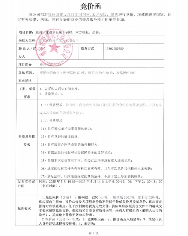 雅州印建設(shè)項(xiàng)目廢舊鋼材,木方模版出售競價公告