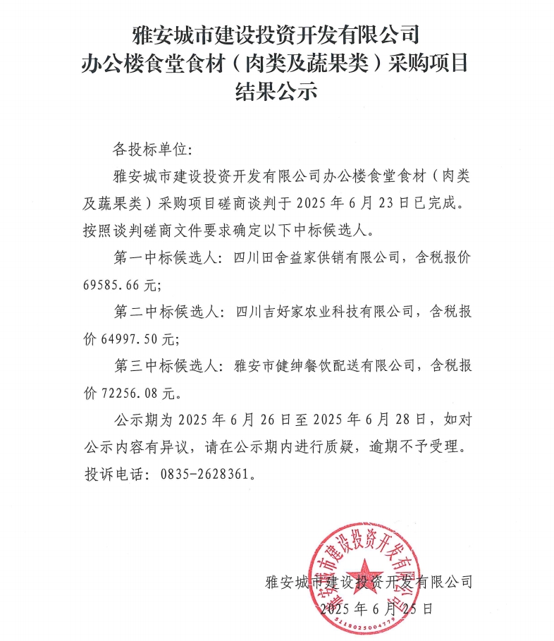 雅安城市建設(shè)投資開發(fā)有限公司城投辦公樓食堂食材(肉類及蔬果類)采購項(xiàng)目結(jié)果公示