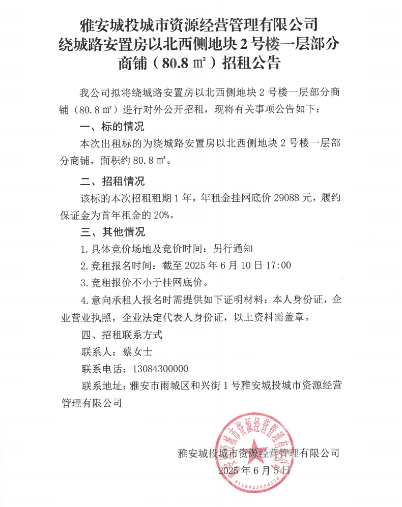 雅安城投城市資源經(jīng)營管理有限公司繞城路安置房以北西側(cè)地塊2號(hào)樓一層部分商鋪(80.8m²)招租公告