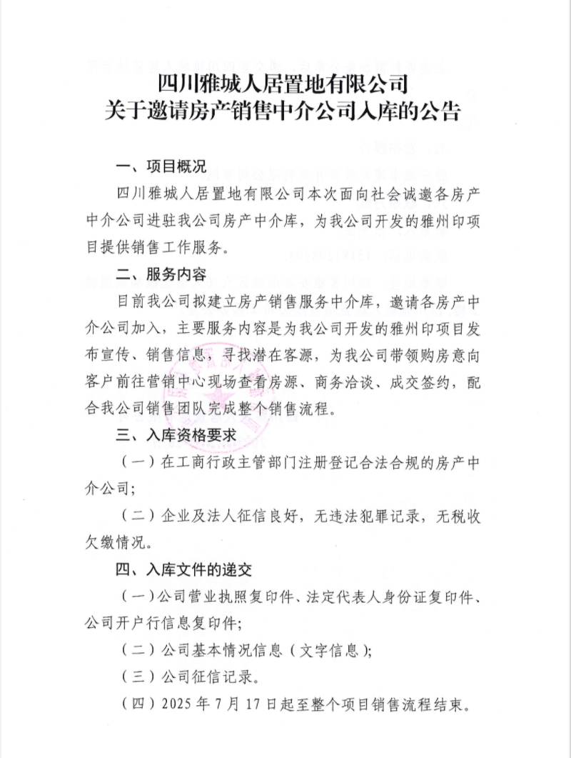 四川雅城人居置地有限公司關(guān)于邀請(qǐng)房產(chǎn)銷售中介公司入庫(kù)的公告